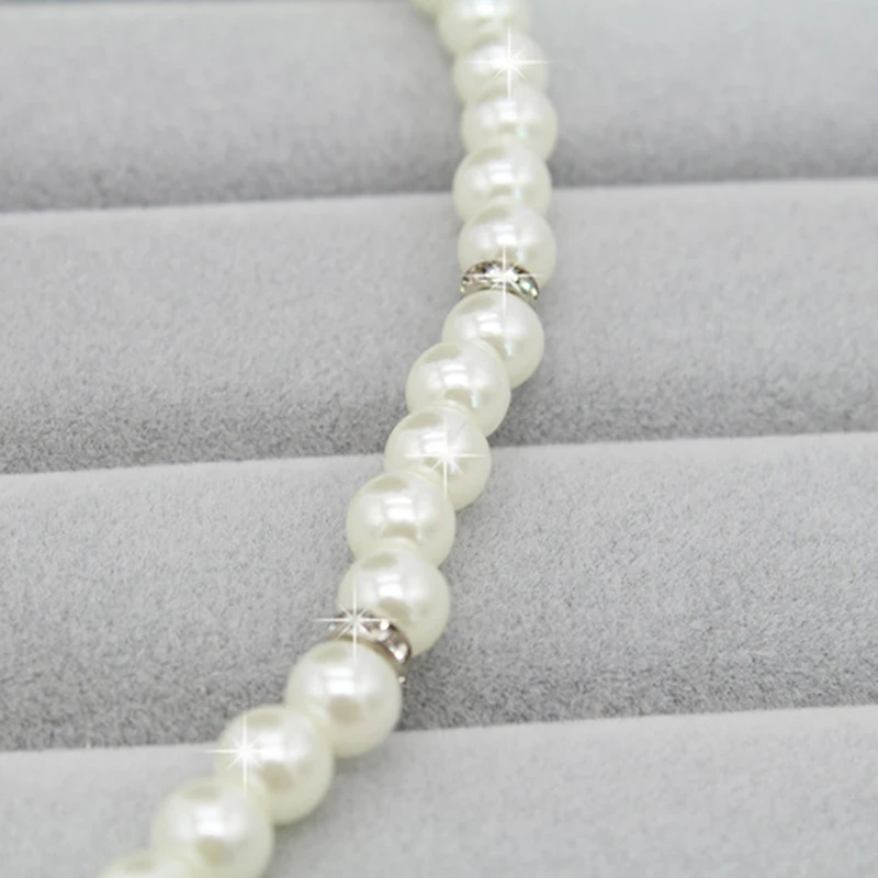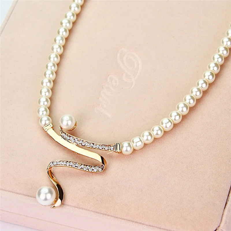O colar apresenta pérolas sintéticas brancas com brilho suave, acompanhadas por um detalhe lateral em curva dourada cravejada de cristais transparentes.