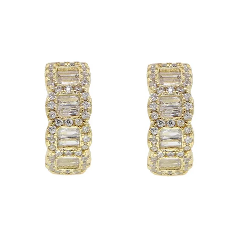 Brinco de argola pequena com zircônias baguete e acabamento dourado. Um brilho elegante para o seu dia.