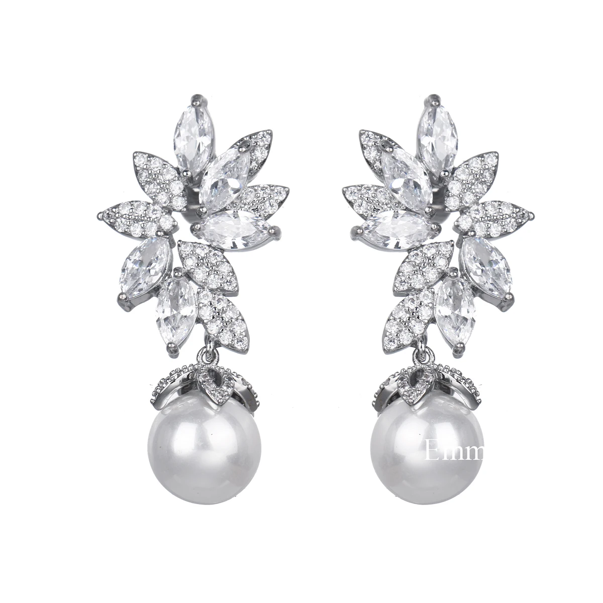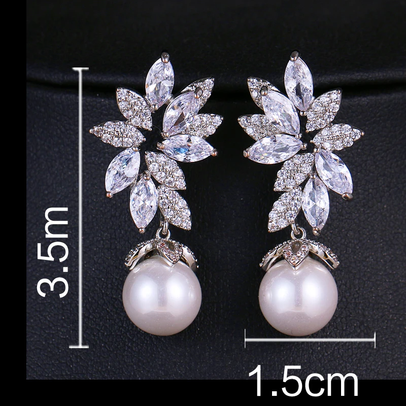 Brincos com design folhado, zircônias brilhantes e pérola pendente. Sofisticação moderna para festas e eventos especiais.