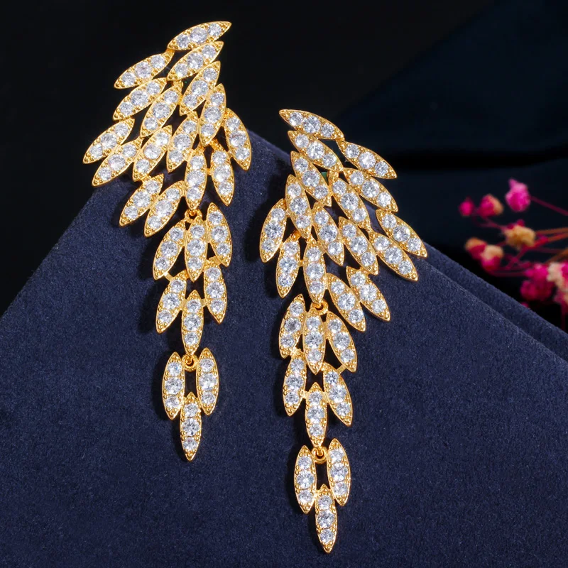 Brincos longos em formato de penas com zircônias AAAAA. Um toque boêmio e sofisticado.