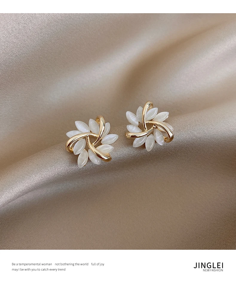 Brinco com pétalas em opala e estrutura dourada. Elegância clássica com toque delicado.