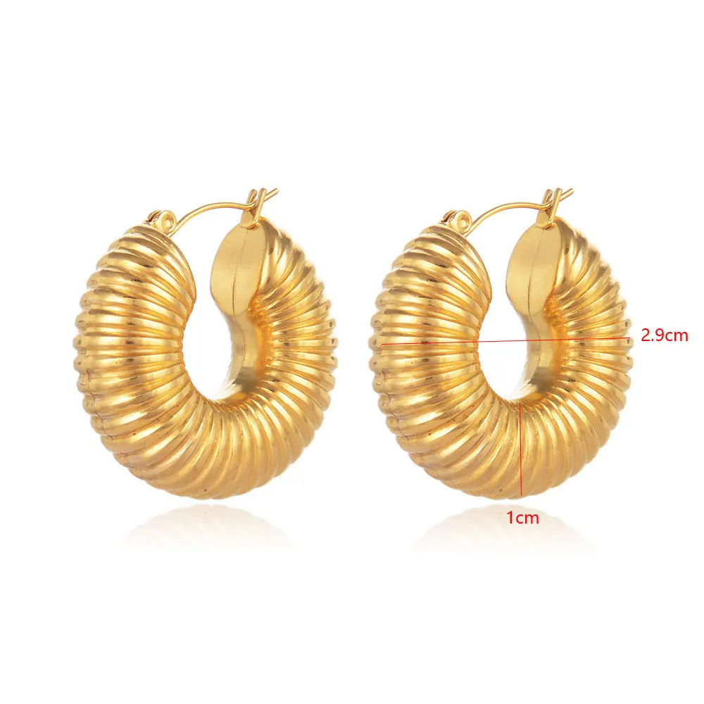 Estes brincos de argola apresentam um design encorpado e textura canelada que confere sofisticação e personalidade à peça. Com acabamento dourado e fecho articulado, são ideais para mulheres que buscam elegância com presença.