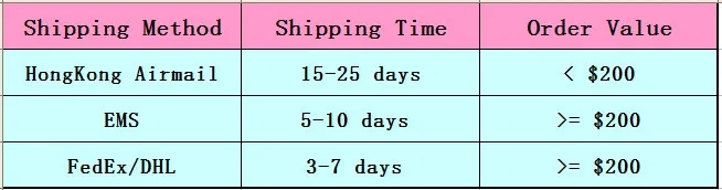 Normalmente, nosso prazo de entrega é15-25 dias.Por favor, não nos impressione com efeito negativo se o correio aéreo internacional for perdido ou atrasado.Se você não receber suas mercadorias dentro25 dias, você pode entrar em contato conosco imediatamente para resolver juntos com você.Devemos manter uma boa comunicação e uma excelente reputação comercial.Nosso grande objetivo é garantir a satisfação total de cada cliente.Se você realmente não pode aceitar nossa política de correio, pense claramente e depois dê um lance.Você pode entrar em contato conosco a qualquer momento se tiver alguma dúvida ou demanda.Depois de concordar com isso e depois licitar.