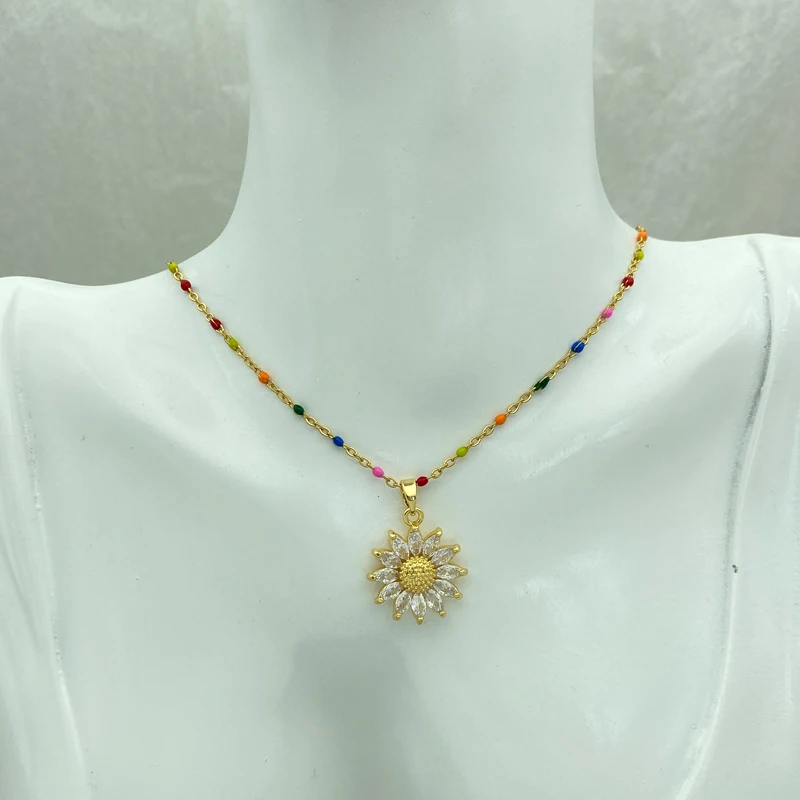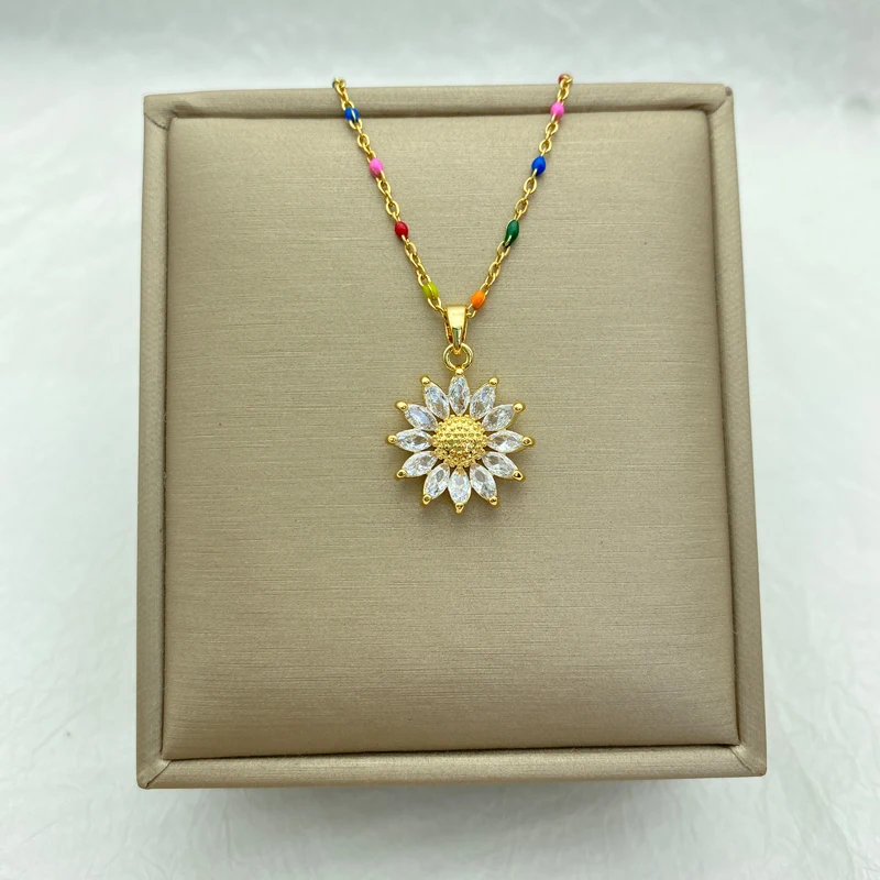 Colar com pingente de girassol cravejado com zircônias brilhantes. Um toque de luz para elevar qualquer look.