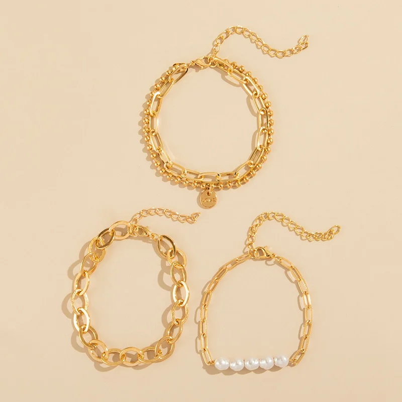 Pulseiras douradas com design geométrico e toque de pérolas. Um mix encantador para brilhar com leveza.