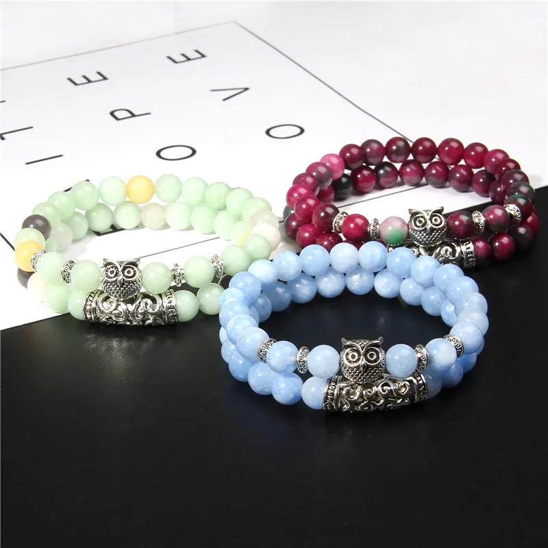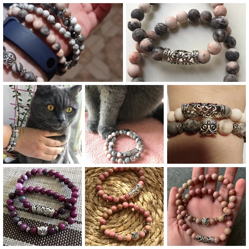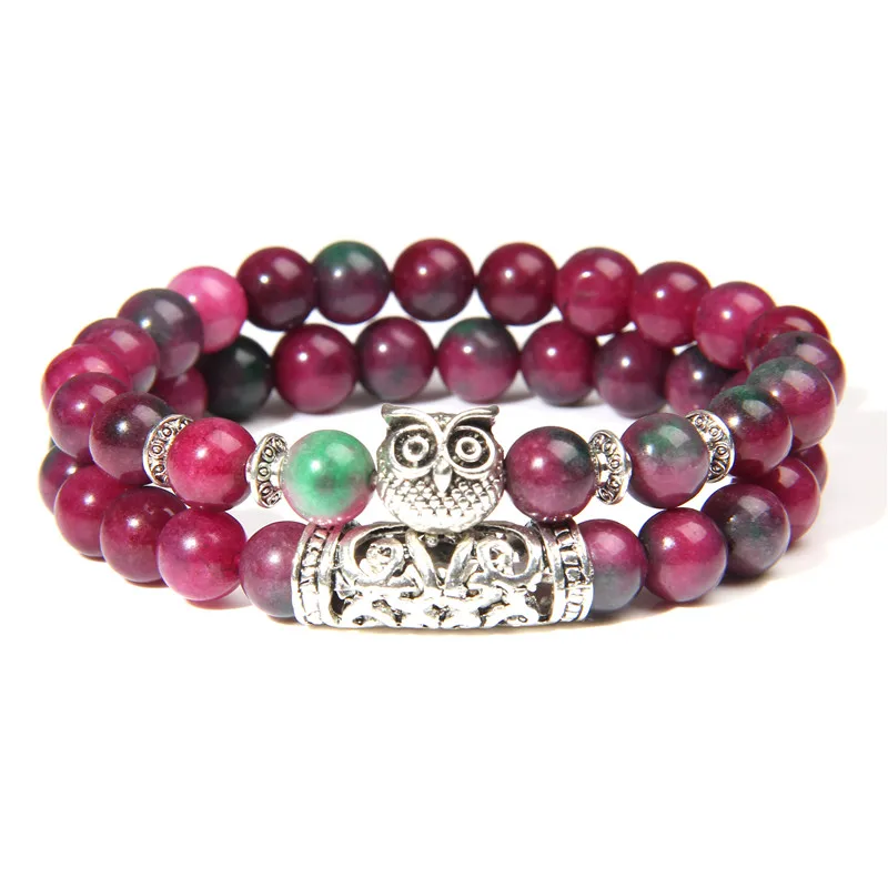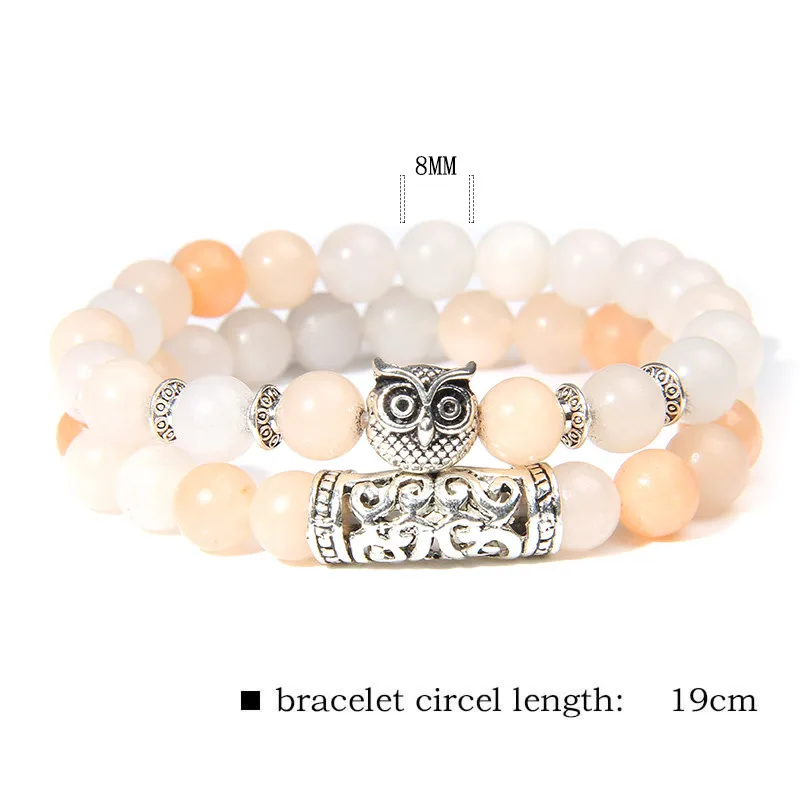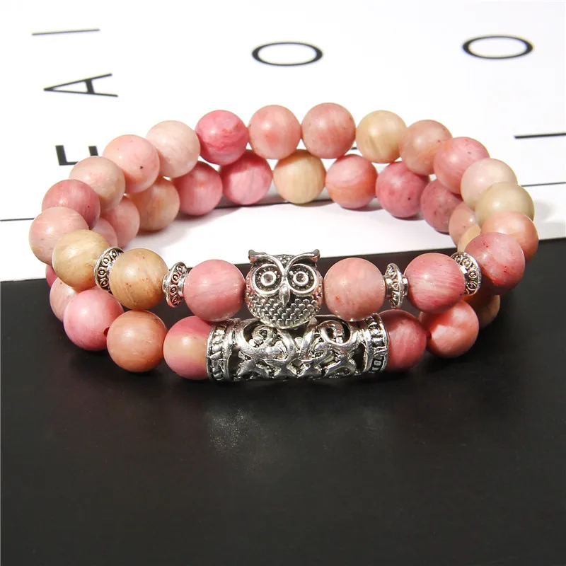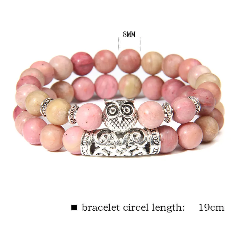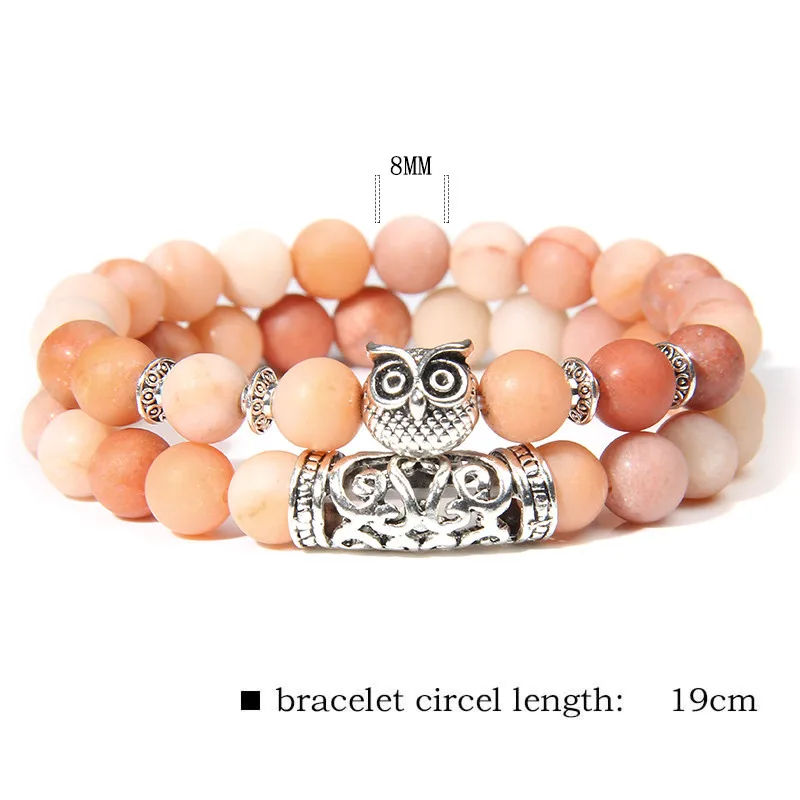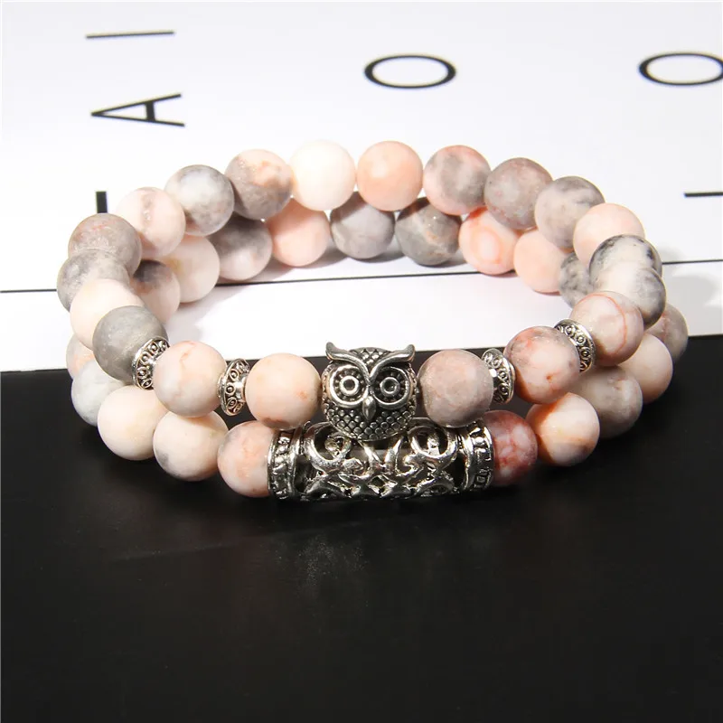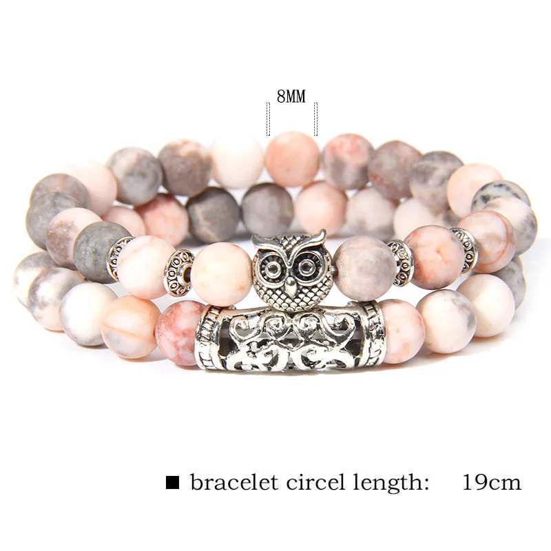 2 pçs/set Natural Rosa Zebra Pedra Beads Pulseira Mulheres Moda Coruja Charme Energia Sorte Pulseira para Mulheres Meninas Jóias Presentes