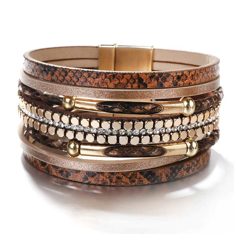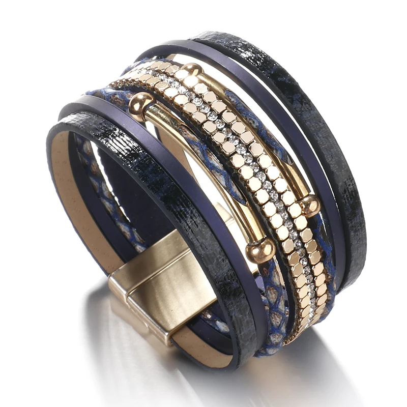 Pulseira de couro com camadas texturizadas e fecho magnético. Um abraço de estilo no seu pulso.